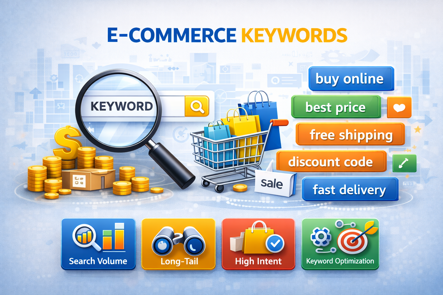 E-commerce keyword research strategy targets buyer-focused search terms that increase product visibility, drive qualified traffic, and improve online sales conversions.